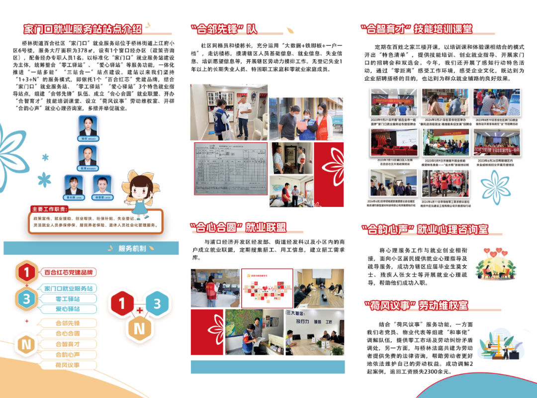 百合社区位于桥林新城核心板块,区域面积达12.1平方公里,辖区内有上江府、春江苑、科成苑3个安置小区共56栋5318套安置房,安置房面积约70万平方米,常住人口4441户12404人。社区紧靠地铁沿线,与浦口经济开发区工业园区仅一路之隔,存在就业困难人员数量大、周边企业商户多、招求聘信息不对称等特点。在建设过程中,社区党总支深度融合党建品牌,打造“1+3+N”红色联盟就业服务机制,依托“百合红芯”1个党建品牌,完善阵地优化配置,整合“家门口”就业服务站、“零工驿站”“爱心驿站”3个特色就业指导站点,开展就业需求排摸、就业供需匹配、就业能力提升、就业心理援助、劳动纠纷维权等多项核心服务功能,通过“稳定就业”强化社区党建引领为民服务工程,促进社区和谐稳定。