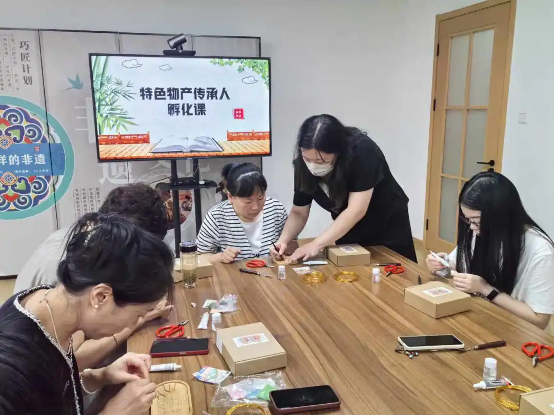 社区邀请非遗大师对困难家庭集中开展培训,手把手教授金箔杯、金箔葫芦等手工艺品制作方法,至今已培养20余名特色物产传承人。社区积极链接企业、图书馆等资源,拓展线上渠道,助力引流销售,帮助困难居民通过非遗技艺增收创收,截至目前已累计销售数万元。社区“不一样的非遗”馆吸纳残障群体、困难群体为讲解员,开设“非遗幸福课堂”,提升居民文化素养,塑造向上向善的社区精神,引荐特色物产传承人带着“绝活儿”走进小区、小学、书店10余次,不仅拓宽就业舞台,更是为非遗技艺的传播注入新动能。