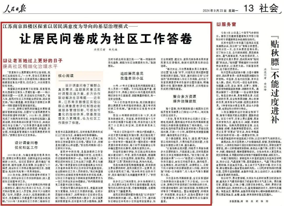 设计调查问卷了解群众真实需求、追踪居民意见实时调整改造方案、多方协作联动解决生活难题……近年来,江苏南京鼓楼区实验以群众满意度考评机制推动街道服务管理创新,可感知可量化的指标体系,使基层治理发力更精准,也为社区工作提供了依据。