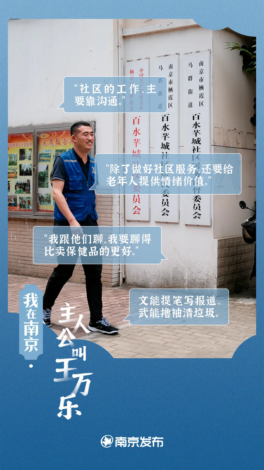 王万乐先后获得马群街道高质量发展先进个人、栖霞区“最美网格员”、南京市“最美网格员”、南京市“最美社区工作者”、“江苏省最美网格员”等荣誉。他跟同事们,每天穿上蓝马甲,服务百水芊城两千多户、六千多人。百水,芊城,万乐,“亿点点”服务,新时代“枫桥经验”践行者。