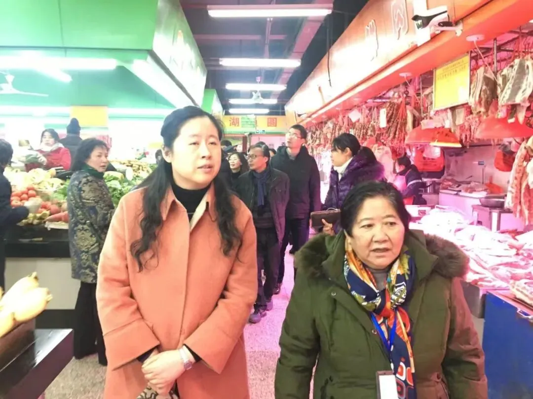 南京市菜篮子工程促进会副会长盛丽琴(右一)深入农贸市场一线,以51年坚守守护市民“菜篮子”安全。