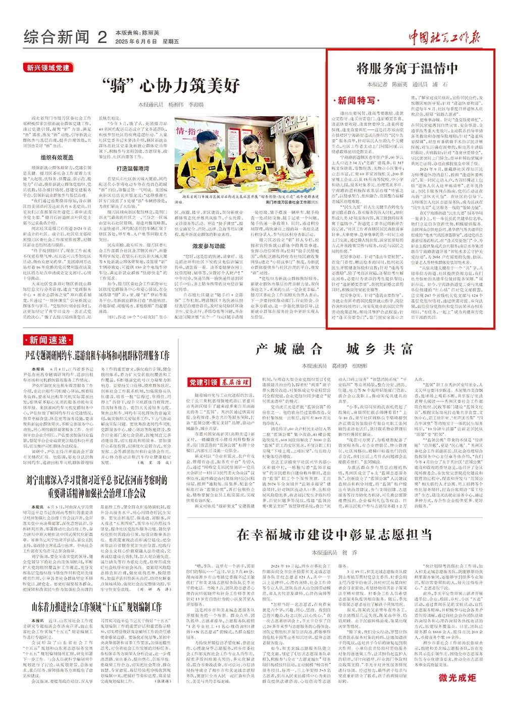 2025年6月6日,《中国社会工作报》刊发文章《将服务寓于温情中》,此文聚焦江苏省南京市鼓楼区宁海路街道试点推行“民生九要”服务清单,积极探索基层治理“情感之治”,以情感契合、组织融合、资源整合破解老城区治理难题。
