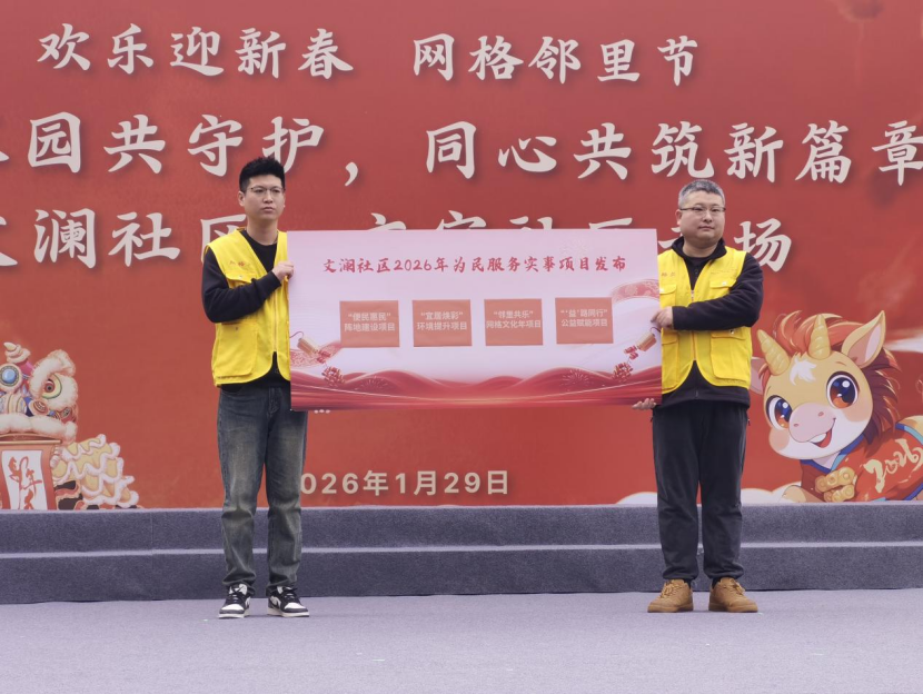 活动现场,文澜社区2026年为民服务实事项目发布。这份沉甸甸的“民生清单”涵盖“便民惠民”阵地建设、“宜居焕彩”环境提升、“邻里共乐”网格文化年、“‘益’路同行”公益赋能四大类,桩桩件件都紧扣居民“急难愁盼”,既有社区文化广场、户外宣传栏等阵地建设,也有青少年读书、老年大学等便民服务,更有环境整治、公益帮扶等民生举措,为新一年社区治理划定了“民生坐标”。