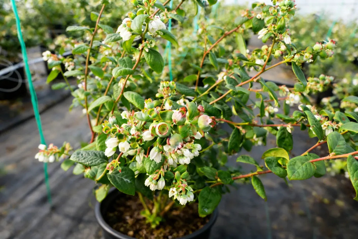 循着她的目光望去,一排排蓝莓树整齐列队,枝头密密匝匝的白色小花簇拥成团。俯身细看,花丛间已有零星果实探出脑袋——小指甲盖大小,青绿中透出淡淡紫晕,在透过大棚的暖阳下泛着微光。更多的花朵还在枝头绽放,五片花瓣微微卷边,静静等待着凋落、授粉、结果。这是蓝莓最富生机的时节:花开满枝,幼果初成,一株树上同时演绎着孕育与希望。