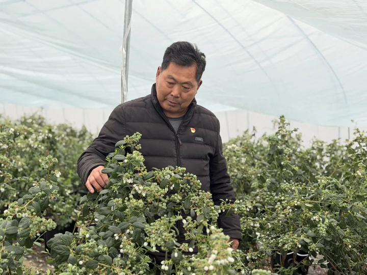 就在这片丰收在望的景象中,一位皮肤黝黑、步伐矫健的老党员正俯身察看花情。他是张友才,石头寨村的党员示范户,也是当地有着近20年经验的蓝莓种植带头人。从最初几亩地试种,到如今总面积达100亩,张友才把大半辈子心血都倾注在了这片土地上。2025年,石头寨村党总支帮助引进新品种、新技术,瞄准早春市场空白,他新建暖棚15亩,主栽F6、L11等优质品种,凭借多年摸索出的成熟管护技术,让蓝莓在3月中下旬就能抢鲜上市。