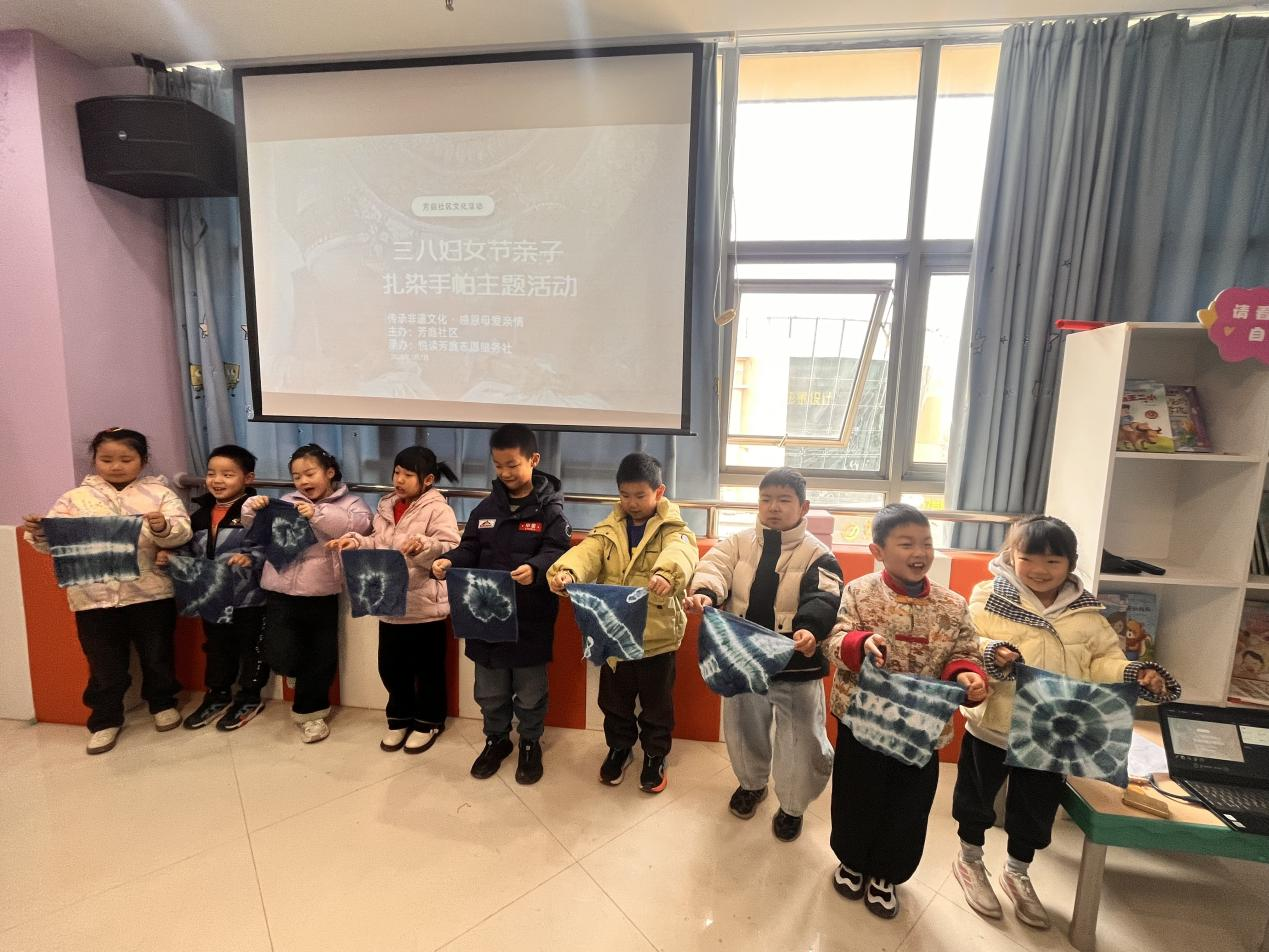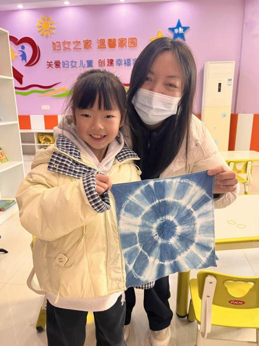 活动伊始,志愿者老师通过趣味提问的方式,向在场的孩子与妈妈们讲述妇女节的由来,引导孩子们领悟节日背后的深刻意义,感受女性的伟大与不凡。紧接着,为契合节日主题,扎染老师现场展示并揭秘了螺旋纹、波点、立体花朵等非遗扎染技法,凭借三根皮筋、几颗弹珠的“小魔术”般操作,瞬间点燃了孩子们的探索热情。亲子协作间,捆扎、浸染、氧化,普通的白棉布在靛蓝色彩中变幻出万千姿态,或如青花瓷般典雅,或似星空般浪漫。当孩子们将亲手制作的扎染手帕递到妈妈手中,伴着温暖的拥抱与贴心的悄悄话,亲情在互动间悄然升温,美好在心底深深扎根;爱的种子在社区里脉脉传递,更让“精致”的人文底色,在文化的滋养与情感的交融中愈发鲜亮动人。