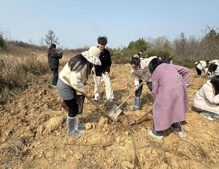 讲解结束后,植树活动热火朝天地展开。大家分组协作,挥锹挖坑、扶苗培土、踩实浇水、围堰固根,每个环节都一丝不苟。社区党员与师生们相互配合、默契协作,现场氛围热烈而有序。不一会儿,一排排新栽的青梅树错落有致、迎风挺立,为蟹塘社区增添了盎然生机。大家在劳动中增进了交流、拉近了距离,以实际行动践行绿色发展理念。