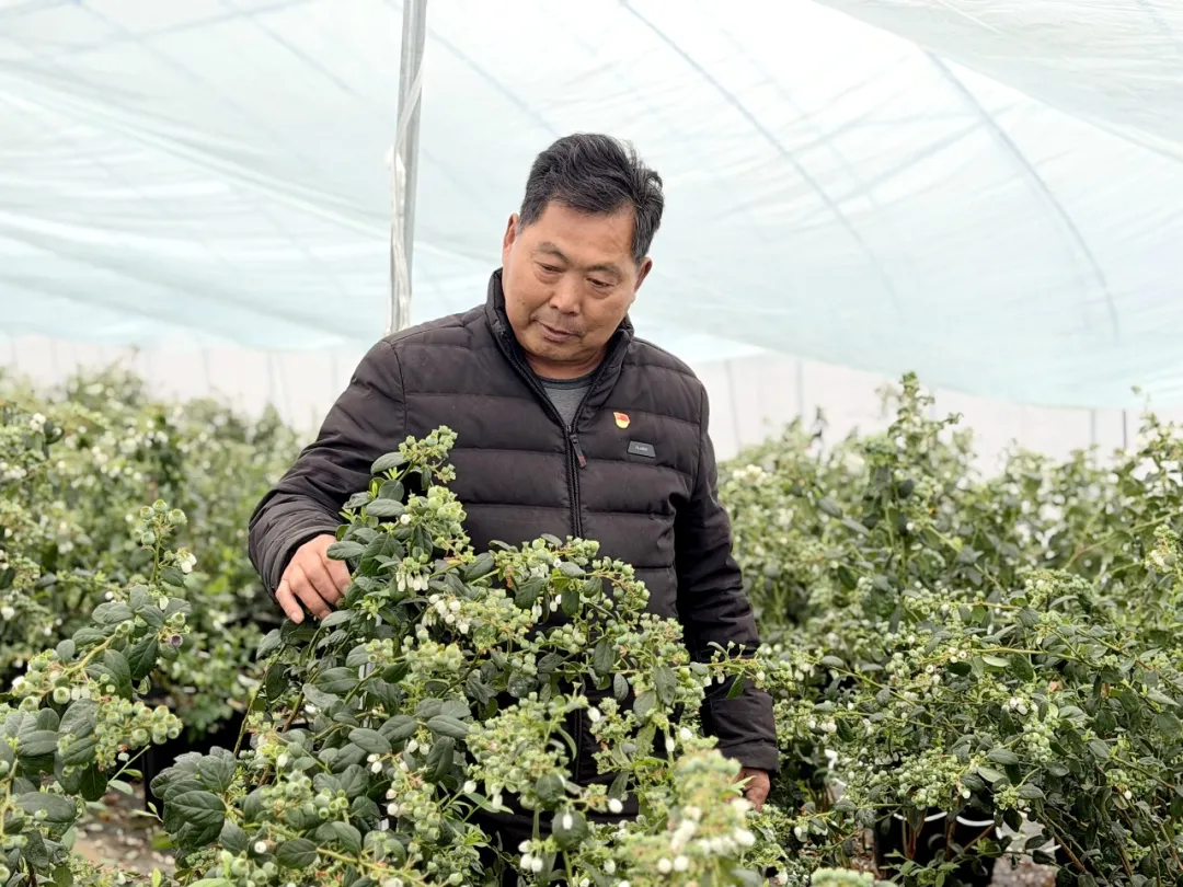 这片暖棚的主人叫张友才,是位老党员。作为石头寨村的党员示范户,这位有着近20年经验的蓝莓种植带头人,把大半辈子心血都倾注在这片土地上。