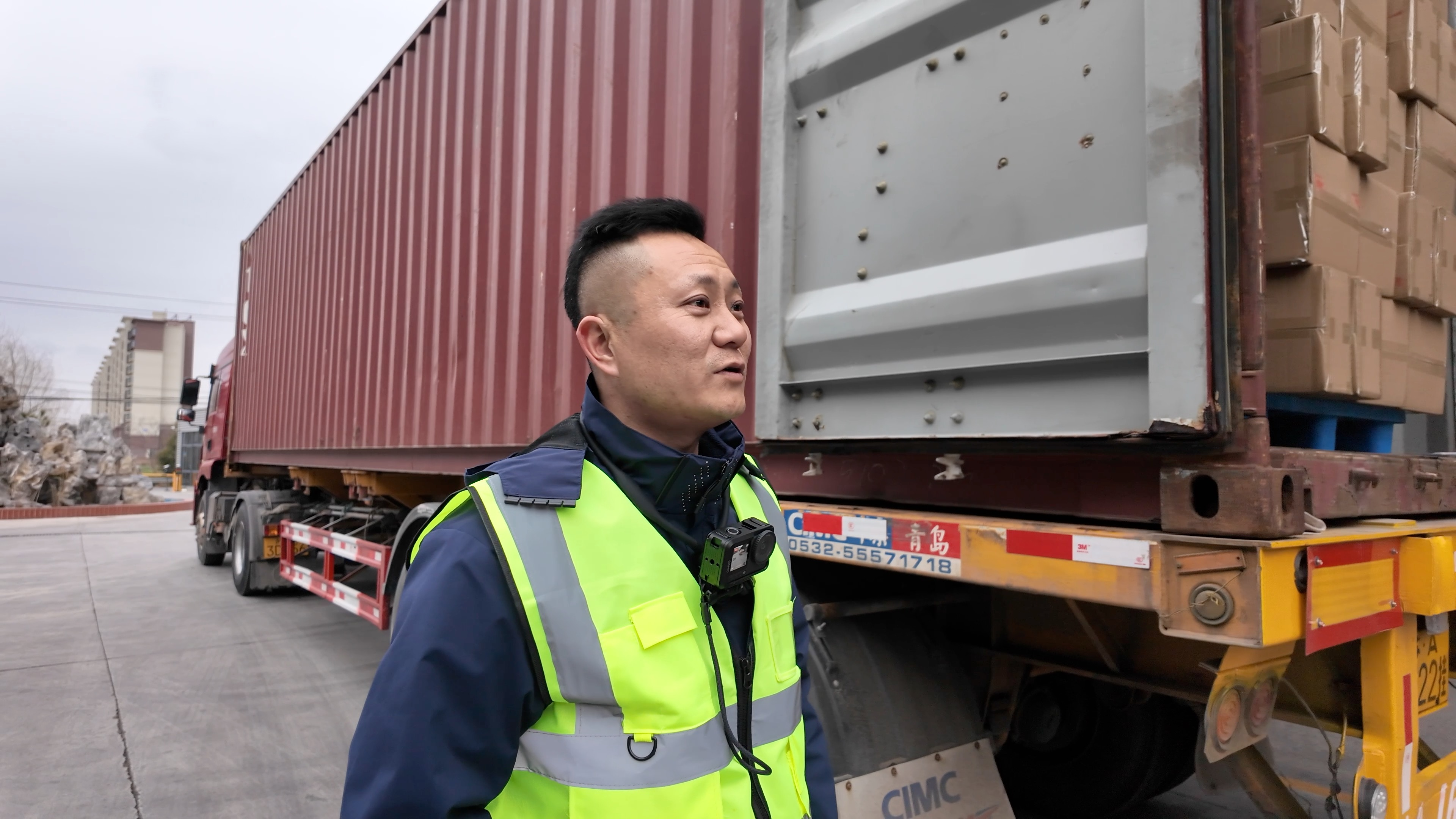 离开港口时天已大亮。韩坚上午的目的地是扬州仪征的张集,这里玩具工厂的产品主要供应美国市场。在工厂装货的时间里,韩坚不像别的许多集卡司机那样在床上躺着,而是会下来帮帮忙,拍拍抖音小视频。