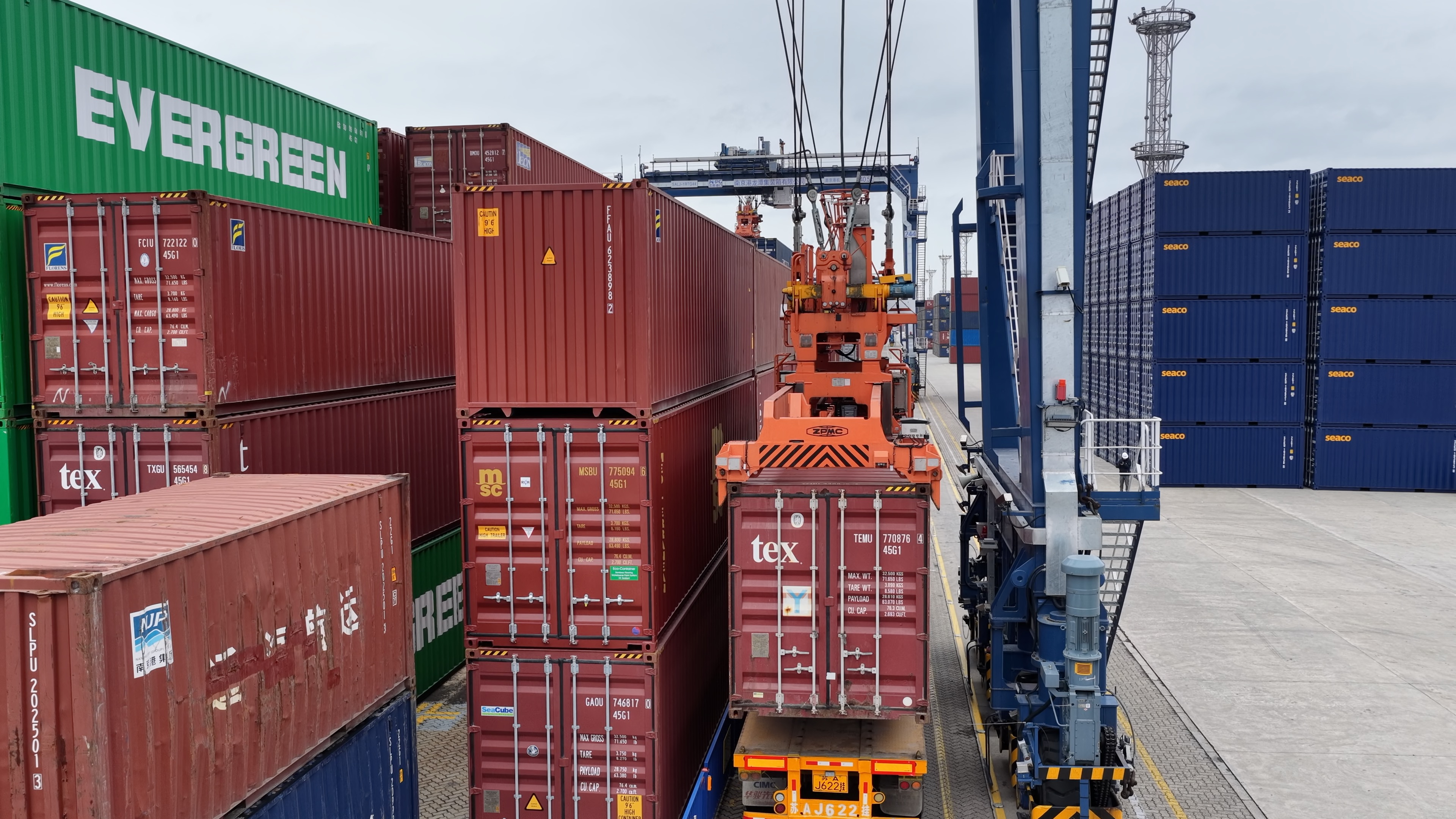 在港口的堆场,机械臂抓起一只空集装箱,悬在车子上方,韩坚仅凭倒后镜就准确地把车停好位置,“哐啷”一声,集装箱刚好落在车上,四角的固定锁孔一次性精准落位。两位司机配合默契。