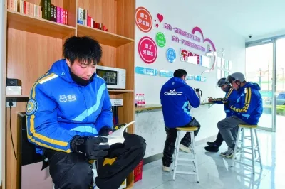 江北新区泰山街道弘阳时代中心二期有很多美食商铺,其中一家,门头上“小北·骑手微家”几个字显眼而温暖,这是新建的骑手驿站,即将面向骑手们开放,里面配有饮水机、冰箱、空调等基础设施,可以一次性容纳20余名骑手在此落脚。“这个小屋子挺好的,冬天能避避风。有椅子和小桌子,大家歇息的时候都有地方坐。还安装了插头,在外面跑,最怕手机没电了。”骑手老孙说。