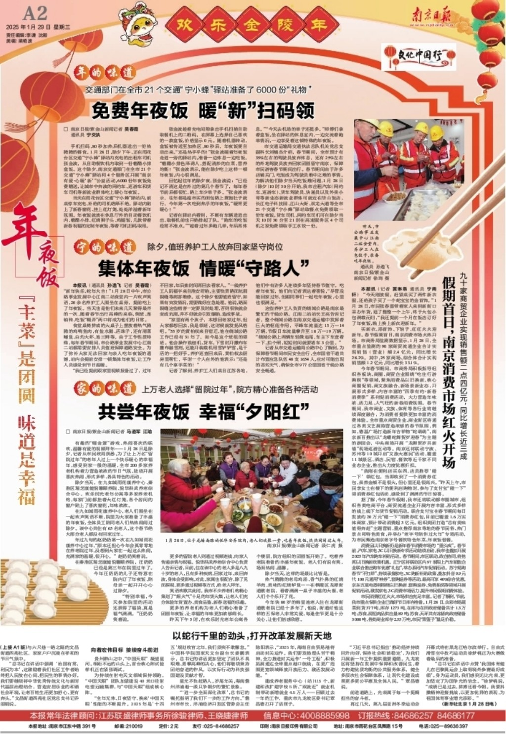 市交通运输局交通执法总队机关党总支副科长刘楠杰介绍,春节期间,全市预计有35%左右的驾驶员放弃休息,还有25%左右的外地驾驶员放弃回家团圆留守南京,保障市民游客春节期间出行。春节期间由于许多店铺关门,吃饭成为驾驶员难中之难的事情。为解决他们除夕当天吃饭难问题,1月28日(除夕)10时30分开始,我市出租汽车(网约车、巡游车)司机、货车驾驶员、快递员以及外卖小哥等新业态新就业群体可就近在华山饭店、长江电子科技园、江山大街、双龙大道等全市21个交通“宁小蜂”驿站取餐点免费领取一份年夜饭。货车司机、网约车司机可在除夕当天10时30分至21时在高速服务区4个司机之家免费领取手工水饺一份。
