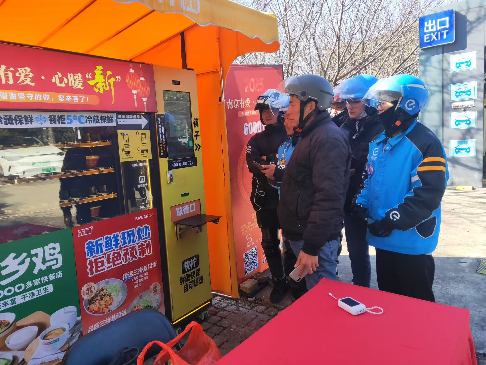 当天在雨花台区交通“宁小蜂”驿站内,前来停车充电、补给的司机络绎不绝。驿站内贴上了新春窗花、挂上了红灯笼,处处洋溢着新年氛围。年夜饭就放在休息厅外的自动餐饮机内,糖醋小排、红烧狮子头、鸡腿饭,几款带着新春祝福的定制年夜饭,等着司机扫码取用。