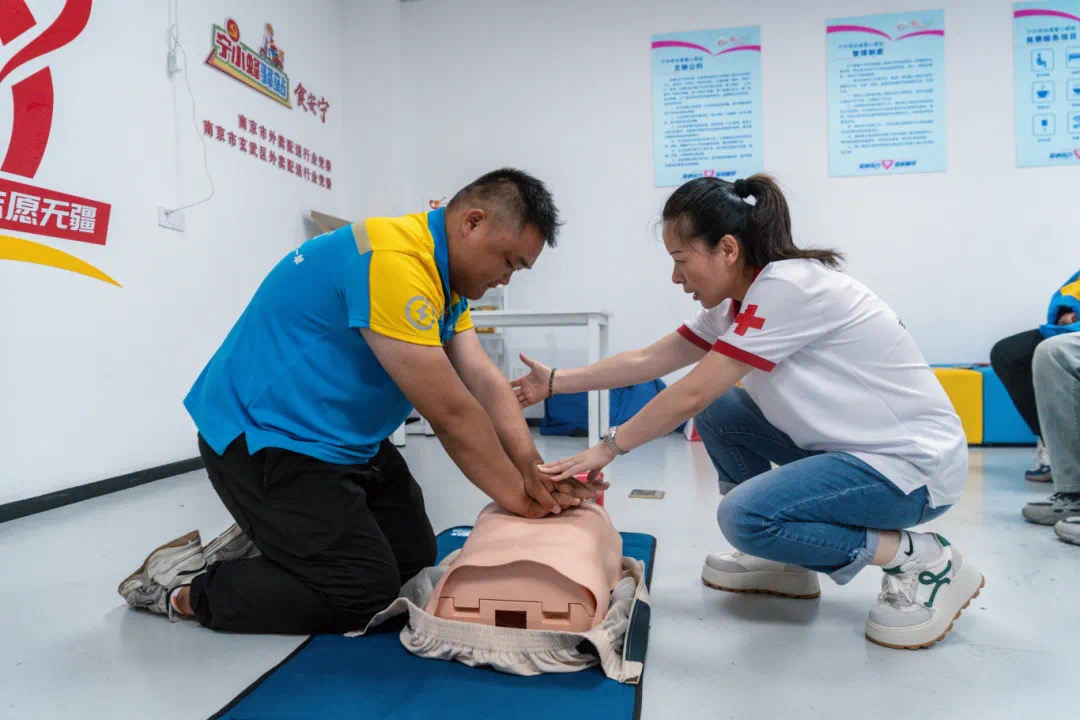 外卖骑手、快递小哥、网约车司机等新就业群体每天穿梭于城市的大街小巷,也常常出现在突发事件的“第一现场”。近日,玄武区梅园新村街道兰园社区联合区红十字会、区见义勇为基金会,在北京东路42号闪送骑士之家开展了“急救技能”专项培训。20余名骑手通过专业学习,掌握了心肺复苏、AED使用、海姆立克急救法等实用技能,也为城市安全网络嵌入了流动的急救节点。