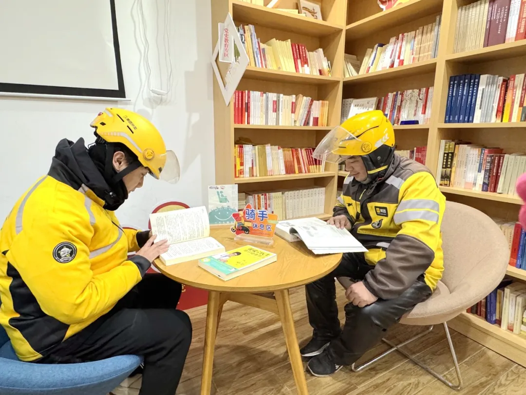 骑手在幕府西路社区“宁小蜂”驿站阅读休息
