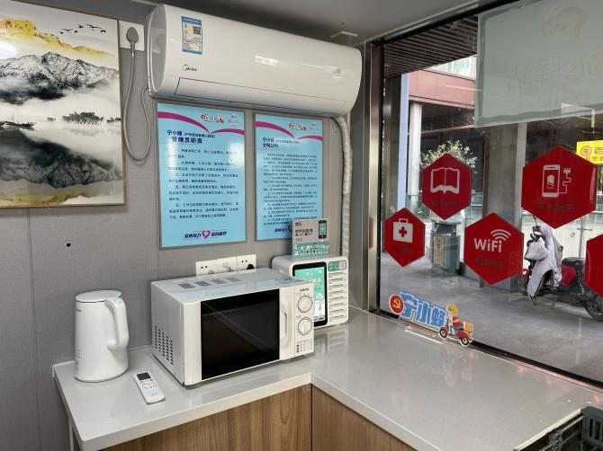 在驿站外,便捷的自助换电柜24小时待命,为奔波的外卖员们快速“满电续航”;专门划设的停车区域让他们能有序停放车辆,不再为停车之事烦扰。步入驿站内部,更是温馨便利。空调送来冬暖夏凉,微波炉让他们能够轻松加热饭菜,饮水机源源不断提供干净的饮用水,医药箱备有常用药品,守护突发的小意外,图书角丰盈短暂的闲暇时光,充电宝和手机充电插座一应俱全,确保通信永不断联………从细微处着手,用真心换真情,南京江北新区葛塘街道美利广场“宁小蜂”驿站成为了新就业群体“冷可取暖、热可纳凉、渴可喝水、累可歇脚”的坚实依靠。