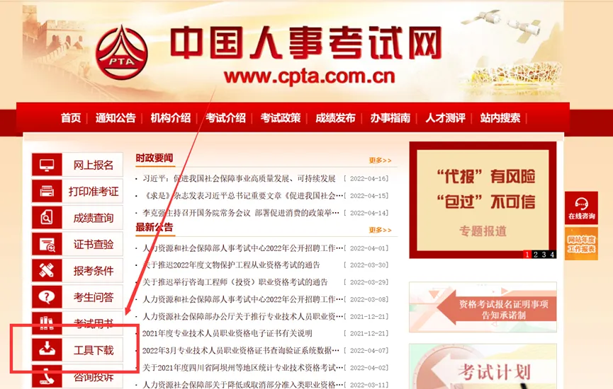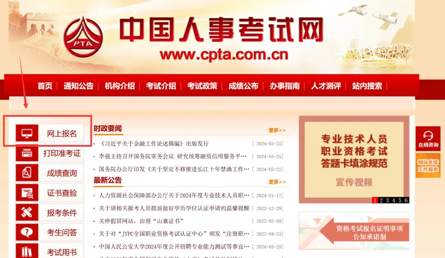 打开官方报名入口“中国人事考试网”(http://www.cpta.com.cn/),点击“网上报名”。