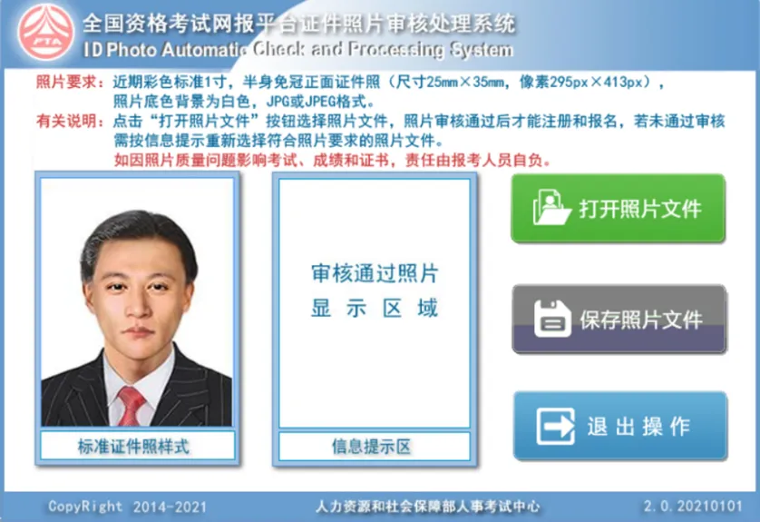 3.如果处理的照片符合要求,将自动调整裁切出标准报名照片;若不符合要求,会提示照片存在的问题。审核通过后点击“保存照片文件”,保存审核合格后的照片文件,默认文件名“报名照片.jpg”。