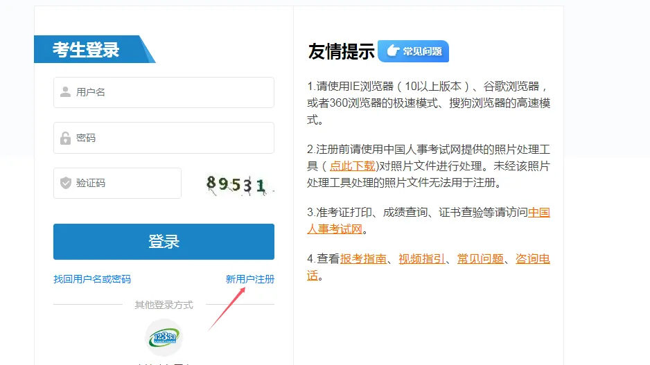 进入“中国人事考试网”,点击“网上报名”,进入考生登录页面,输入用户名、密码、验证码,点击“登录”。