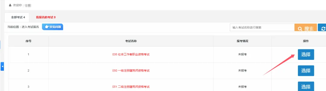 1.找到“038社会工作者职业水平考试”,点击“选择”,弹出“你已选择社会工作者职业水平考试”,点击“确定”。弹出信息确认后,点击“我已知晓”。