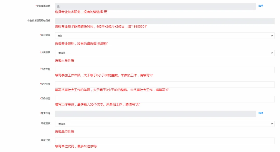 (12)工作年限必须大于等于专业年限。这里的专业年限是指从事社会工作的年限,需要符合之前选择的报考条件。如,报考条件选择“取得其他专业大专学历,从事社会工作满4年”,就必须填写不少于4年的专业年限。