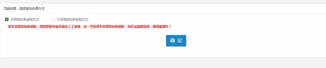6.选择报名办理方式。可以直接选“采用告知承诺制方式”,无需现场核查;如果选择“不采用告知承诺制方式”,考生须上传“单位工作证明”。
