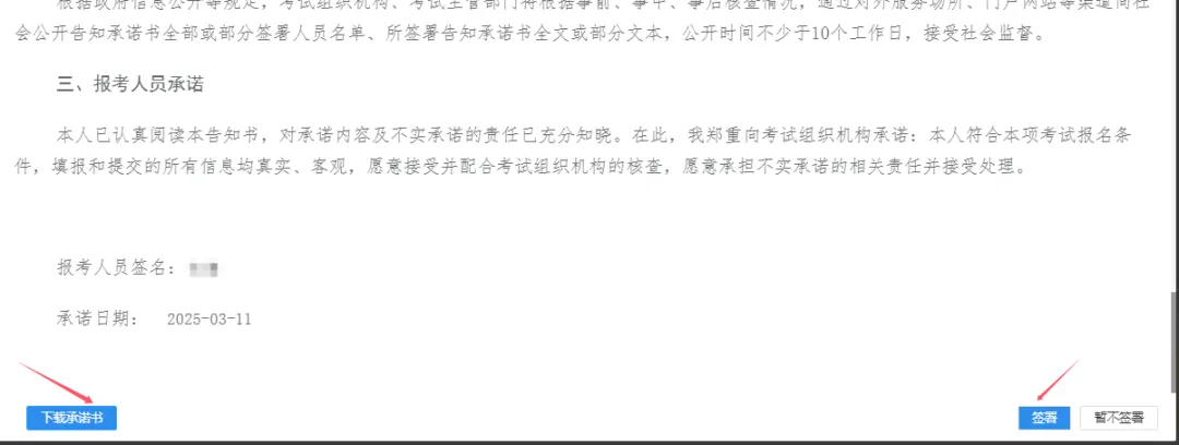 8.签署承诺书。点击“签署”,学历核查系统没有通过的,可以点击“下载承诺书”打印。