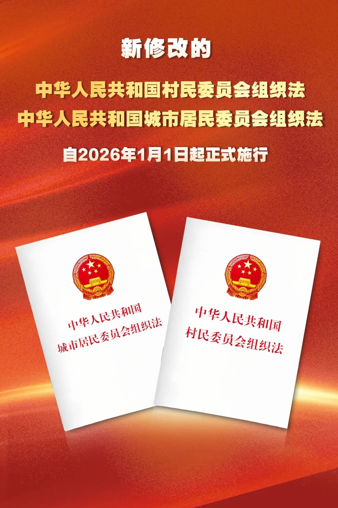 2025年10月28日,十四届全国人大常委会第十八次会议表决通过关于修改村民委员会组织法的决定、新修订的城市居民委员会组织法。国家主席习近平签署第59号、第60号主席令予以公布,自2026年1月1日起施行。根据中央社会工作部、全国人大社会建设委员会、全国人大常委会法制工作委员会权威发布,此次修法旨在落实党中央决策部署,回应基层治理实际需求,为基层减负并明确村(居)委会履职边界。