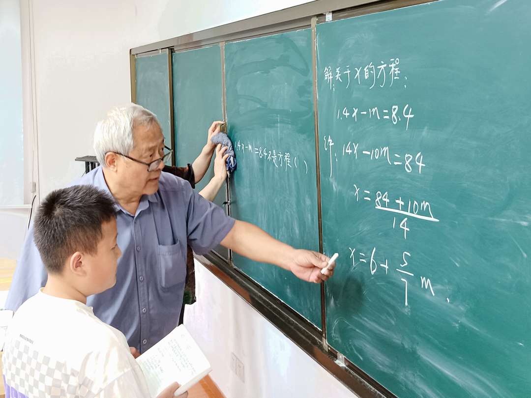 周六下午1点半,莫愁湖畔的知了声此起彼伏,沿河社区的“春蕾”辅导班已经热闹起来。近80岁的马克辛早早来到教室,正在仔细擦拭黑板,午后的阳光透过窗户,将他的身影拉得修长。黑板上还留着上周的几何图形,粉笔灰在光束中轻盈舞动,仿佛在诉说着这位老党员志愿者二十年如一日的坚守。