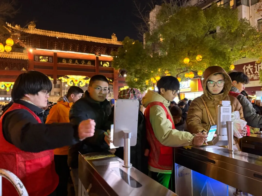志愿者在第40届秦淮灯会入口协助维护游客入场秩序。