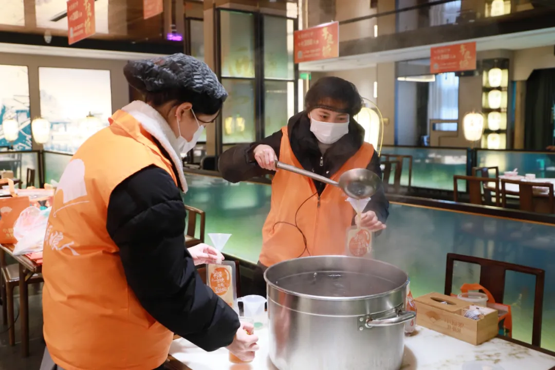 江宁区餐饮企业参与“爱心接力”,为志愿者及扫雪除冰一线工作者准备热茶。