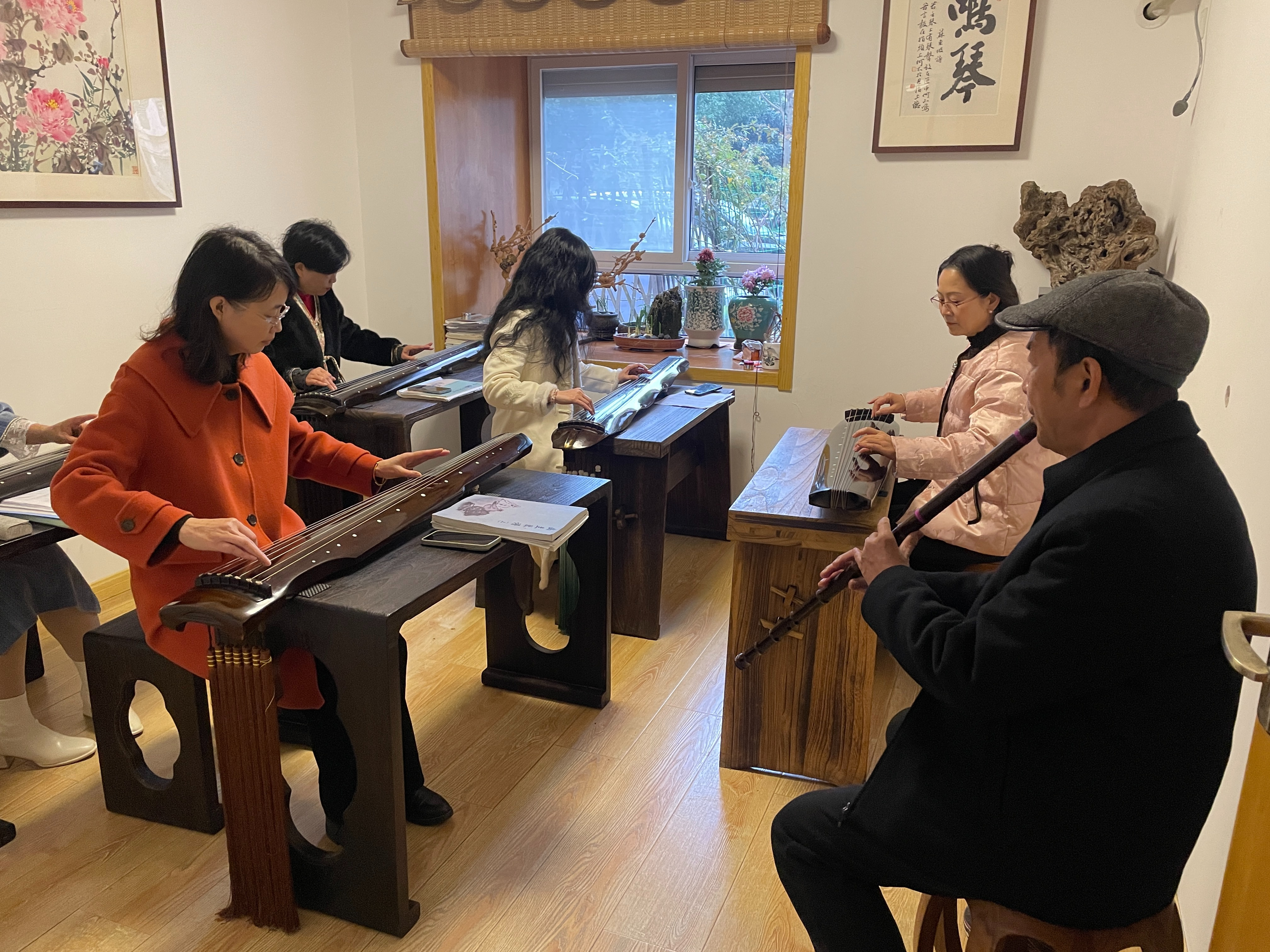 在大圣社区,多才多艺的退休老人轮流开设书法和笛子课程,吸引众多老年居民参与。泰山社区和白果社区,银龄志愿者们手把手教授书法技艺、开展健身操教学。与兰花工作室的合作更为文化传承提供了新阵地:书法家李老师定期授课并认真点评学员作业,古琴大家王老师开设古琴课程悉心示范,让居民感受传统民乐魅力。
