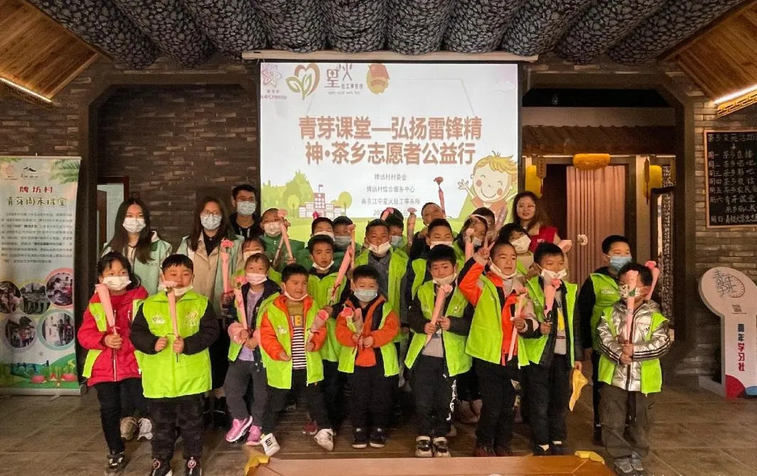 牌坊村以公益创投项目为抓手,大力培育志愿人才。通过引入专业社会组织,派遣专业化社工驻村开展特色志愿服务。村干部中持证社工6人,其中中级社工2人;村志愿者488人,其中党员志愿者26人,占常住人口28%,村民志愿服务参与率达60%。通过组织星火、千百园等驻村社会组织,链接河海大学、南京工业大学、南京晓庄学院等高校资源,定期开展大学生义工旅行、黄龙岘暑期社会实践、茶乡振兴计划等志愿服务活动。