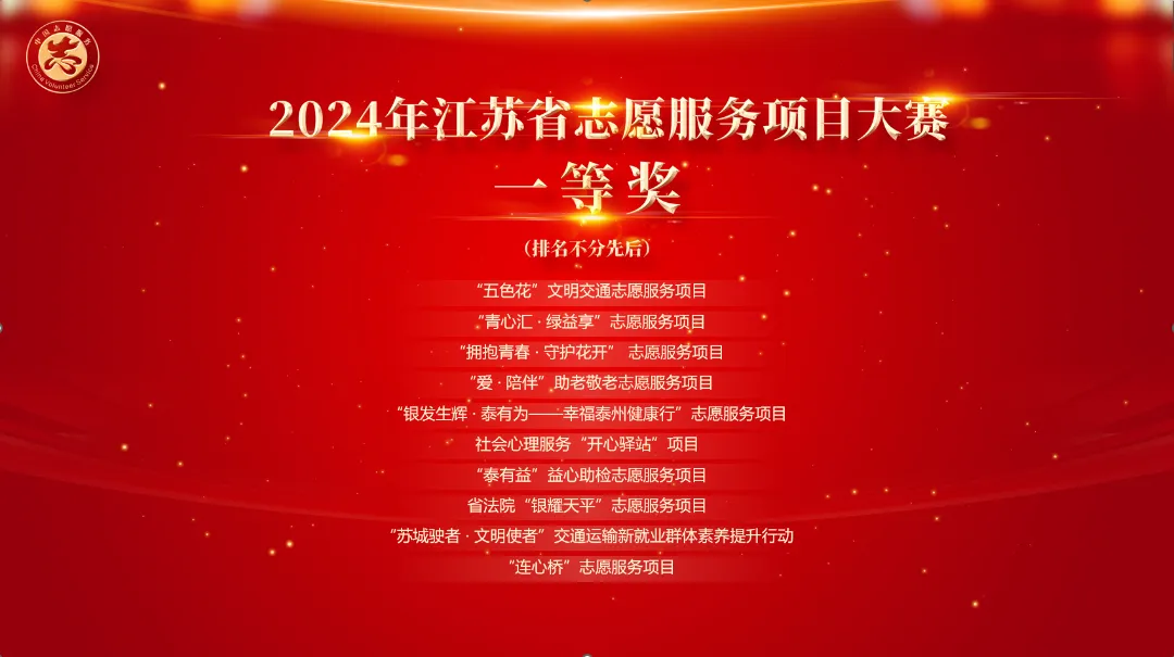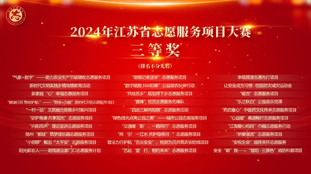 2025年1月4日,由中共江苏省委社会工作部、江苏省精神文明建设办公室、共青团江苏省委共同主办,中共南京市委社会工作部承办的2024年江苏省志愿服务项目大赛在南京圆满落幕。我市共有8个项目脱颖而出,分别荣获一等奖1个、二等奖4个、三等奖3个。