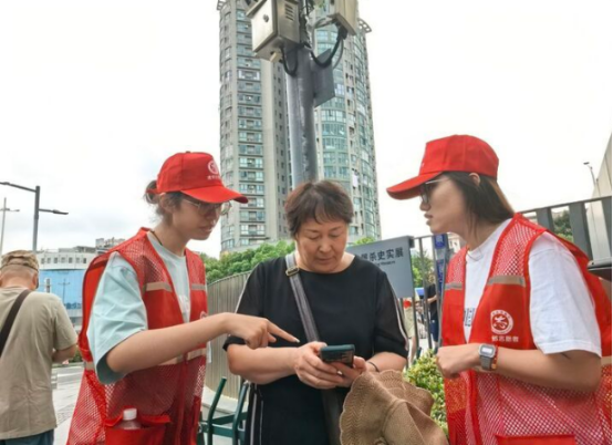 莫愁湖公园日均接待游客3.5万人次,志愿者在入口处引导游客有序入园,对园区道路指示牌进行维护校准,并为游客提供历史文化讲解、游览路线推荐等服务;重点关注特殊群体需求,帮助行动不便的游客办理轮椅借用手续,让温暖服务覆盖每一位游客。
