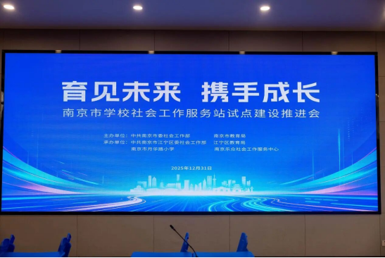 2025年12月31日下午,“育见未来,携手成长”南京市学校社会工作服务站试点建设推进会在月华路小学湖东路校区举行。活动由中共南京市委社会工作部、南京市教育局主办,中共南京市江宁区委社会工作部、江宁区教育局、月华路小学、南京乐众社会工作服务中心承办。省、市、区三级党委社会工作部门、教育部门、省妇女儿童福利基金会相关负责人,与学校、社会组织和社区代表共同参会。