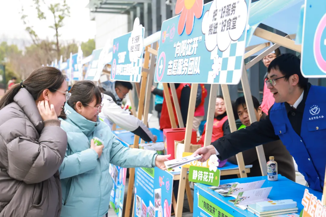 3月4日至6日,由南京市总工会主办的“向新出发 奉献有我”2025年学雷锋职工志愿服务公益市集同步亮相白下高新区五个园区“宁工享・职工食堂”。食堂不仅化身“暖心饭堂”,更升级为“服务综合体”,活动现场设置政策宣传、健康护航、权益维护、知识科普、便民服务、工匠工坊等六大主题服务区,为职工现场解答劳动权益问题,提供职场减压辅导和心理咨询,累计服务职工群众万余人次,发放各类宣传资料2000余份。