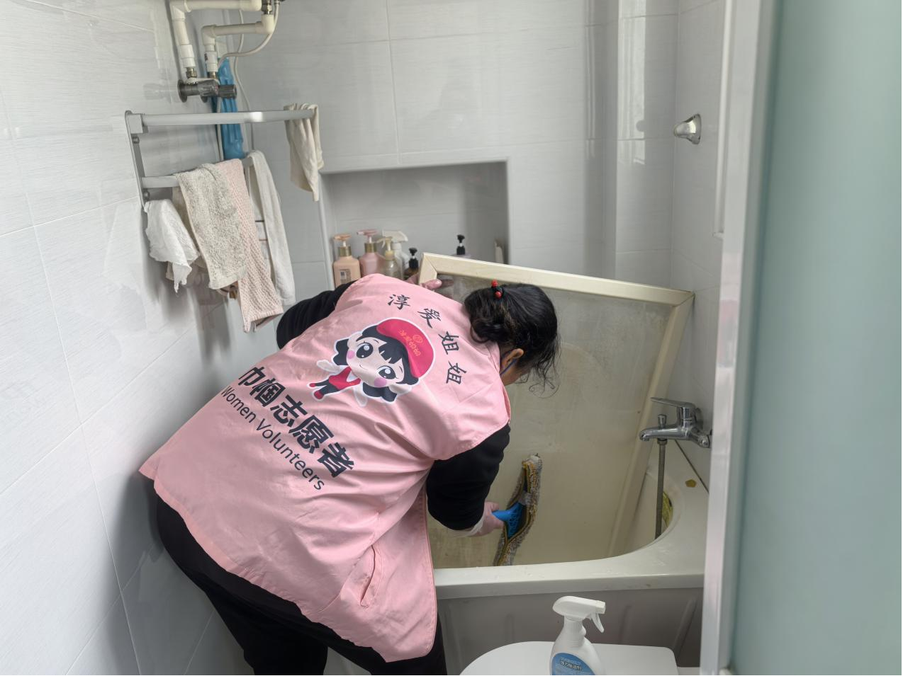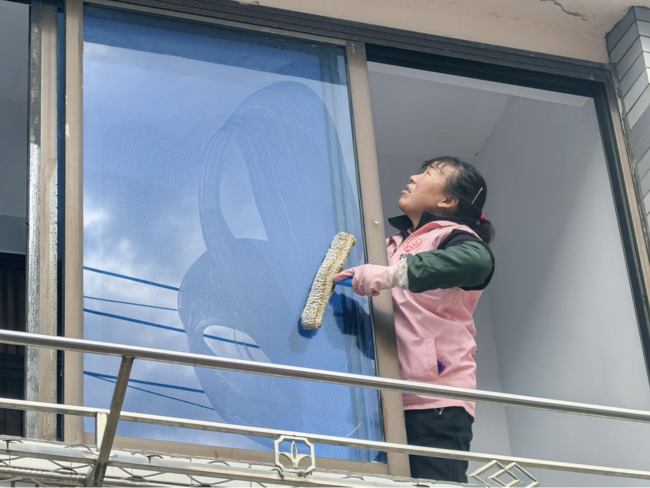 行动胜于言语。活动现场,巾帼志愿者们携带专业工具,迅速分工,有条不紊地投入工作。她们细致地清理窗框缝隙的陈年积尘,一丝不苟地擦亮每一块玻璃,不遗漏任何一处卫生死角。经过一番高效而用心地劳作,房间内原本蒙尘的窗户变得洁净明亮。温暖的阳光毫无阻碍地洒入室内,不仅照亮了焕然一新的居家环境,也映照出老人们喜悦的笑容。