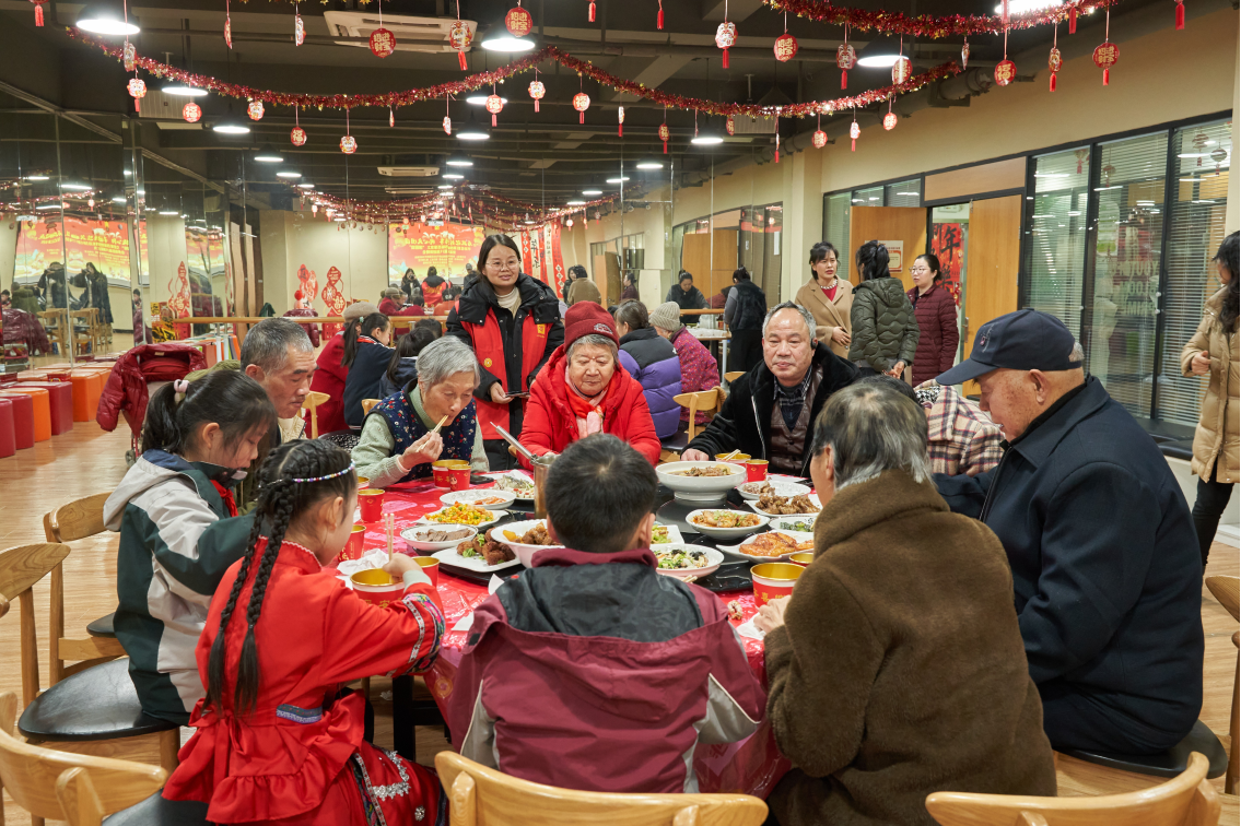 当天,社区二楼多功能厅内,20位受邀特殊群体居民围坐共餐。社区领导班子来到现场,逐一为大家敬酒送祝福,志愿者们全程贴心服务,主动添餐、引导照料,用餐间隙,大家相互送上“马到成功”“新春吉祥”的祝福,一句句暖心话语让整个大厅暖意融融。“社区还记着我们,特意照着我的口味准备饭菜,就像家人一样亲切,这个年过得太舒心了!”一位特困居民感动地说。